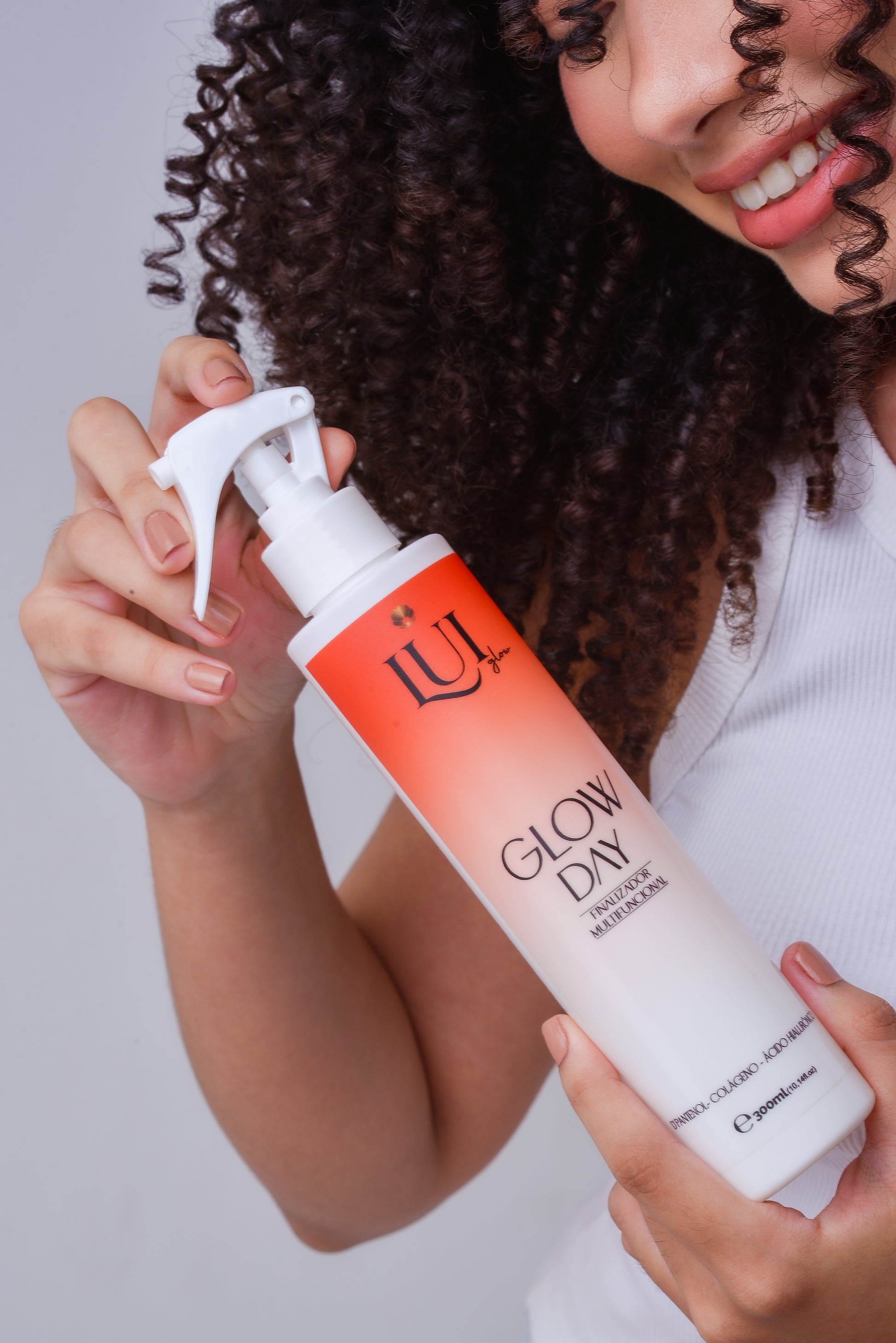 The Glow Day Hair Finisher is a 10.1 fl oz (300ml) hair treatment formulated with D-Panthenol, Collagen, and Hyaluronic Acid.